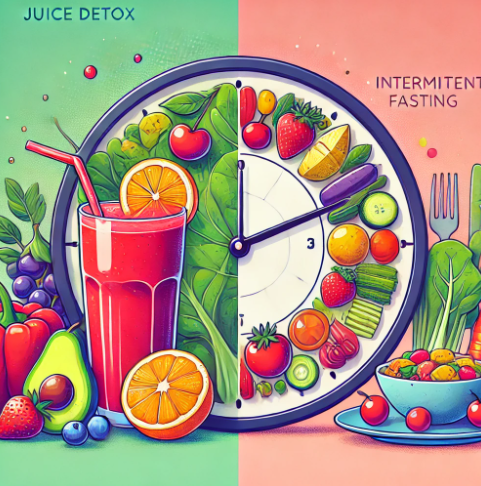 주스 디톡스는 일정 기간 동안 채소와 과일 주스만 섭취하여 체내 독소를 배출하고 영양소를 보충하는 방법입니다. 반면, 간헐적 단식은 하루 중 일정 시간 동안 음식을 먹지 않고 공복 상태를 유지하여 신진대사를 최적화하는 방식입니다.