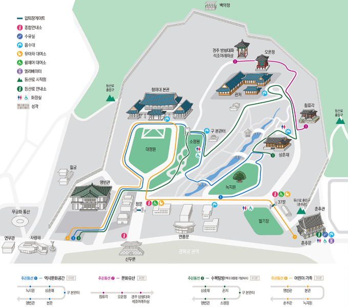 - 어린이 가족 코스: 영빈관, 본관, 녹지원, 춘추관 등 아이들과 함께하기 좋은 동선 (약 30분)